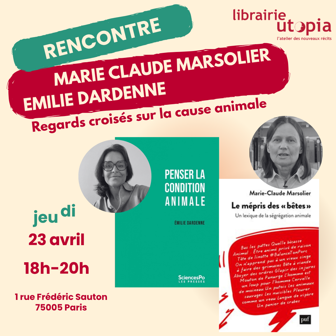 Jeudi 23 avril à 18h : Regards croisés sur la cause animale avec Emilie Dardenne et Marie-Claude Marsolier